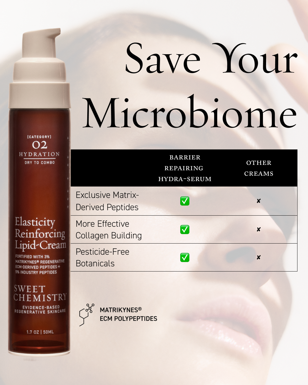 Palmitoyl Hexapeptide-52, Palmitoyl Tetrapeptide-50, Heptapeptide-15, Palmitoyl Heptapeptide-18, Palmitoyl Pentapeptide-4, Copper Palmitoyl Heptapeptide-14, Copper Lysinate/Prolinate, Lactic Acid/Glycolic Acid Copolymer, Ceramide EOP, Ceramide AP, Ceramide NP, Phytosphingosine, Cholesterol, Colloidal Oatmeal, Sodium Hyaluronate, Sodium Hyaluronate Crosspolymer, Hydrolyzed Sodium Hyaluronate, Sodium Acetylated Hyaluronate, Beta-Glucan, Panthenol, Sodium PCA, Sodium Lactate, PCA, Pentylene Glycol, Arginine, Aspartic Acid, Glycine, Alanine, Serine, Valine, Histidine, Phenylalanine, Isoleucine, Proline, Threonine, Thioctic Acid, Ubiquinone, Resveratrol, Tocopheryl Acetate, Bisabolol, Allantoin, Lactobacillus Ferment, Maltodextrin, C12-15 Alkyl Benzoate, Methylglucoside Phosphate, Biosaccharide Gum-1, Sodium Stearoyl Glutamate, Sodium Lauroyl Lactylate, Polyacrylate Crosspolymer-11, Hexylene Glycol, Xanthan Gum, Carbomer, Polyvinyl Alcohol, Propanediol, Trisodium Ethylenediamine Disuccinate, Phenoxyethanol, Ethylhexylglycerin, Caprylyl Glycol